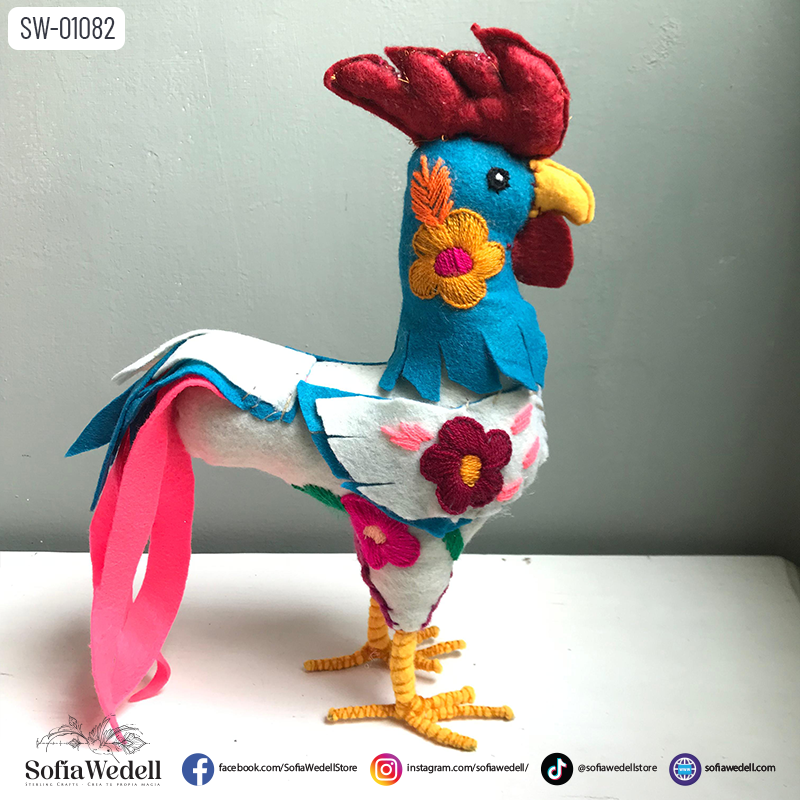 Dale un toque rústico y lleno de vida a tu hogar con este colorido cojín de fieltro en forma de gallo. Resaltado con vibrantes flores bordadas a mano por artesanos mexicanos, es una pieza atemporal y alegre, ideal para darle personalidad a cualquier rincón.